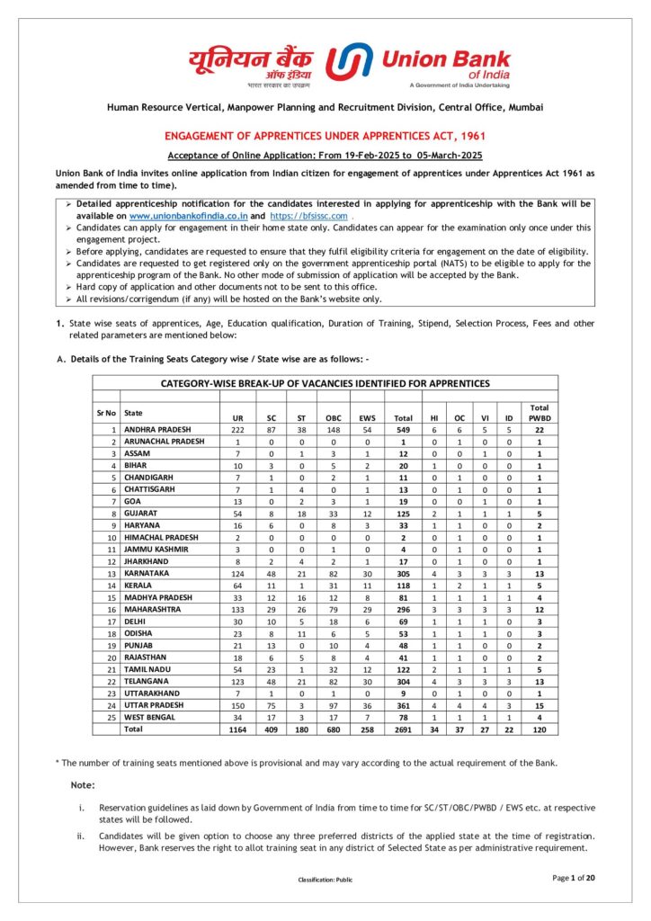 Union Bank of India (UBI) has released an Official Notification for the posts of 2691 Apprentice Vacancy under the Apprentice Act 1961 from Graduate pass candidates interested in sarkari result Union Bank of India Apprentice Recruitment 2025 Online application can apply before 12 March 2025. Please go through this article and follow each tables for full vacancy details, educational qualification, eligibility criteria, pay scale, salary and How to apply Union Bank of India Apprentice sarkari Job opening at official website https://www.unionbankofindia.co.in/